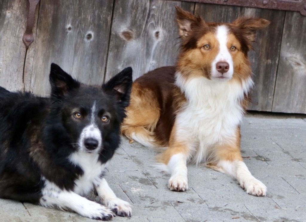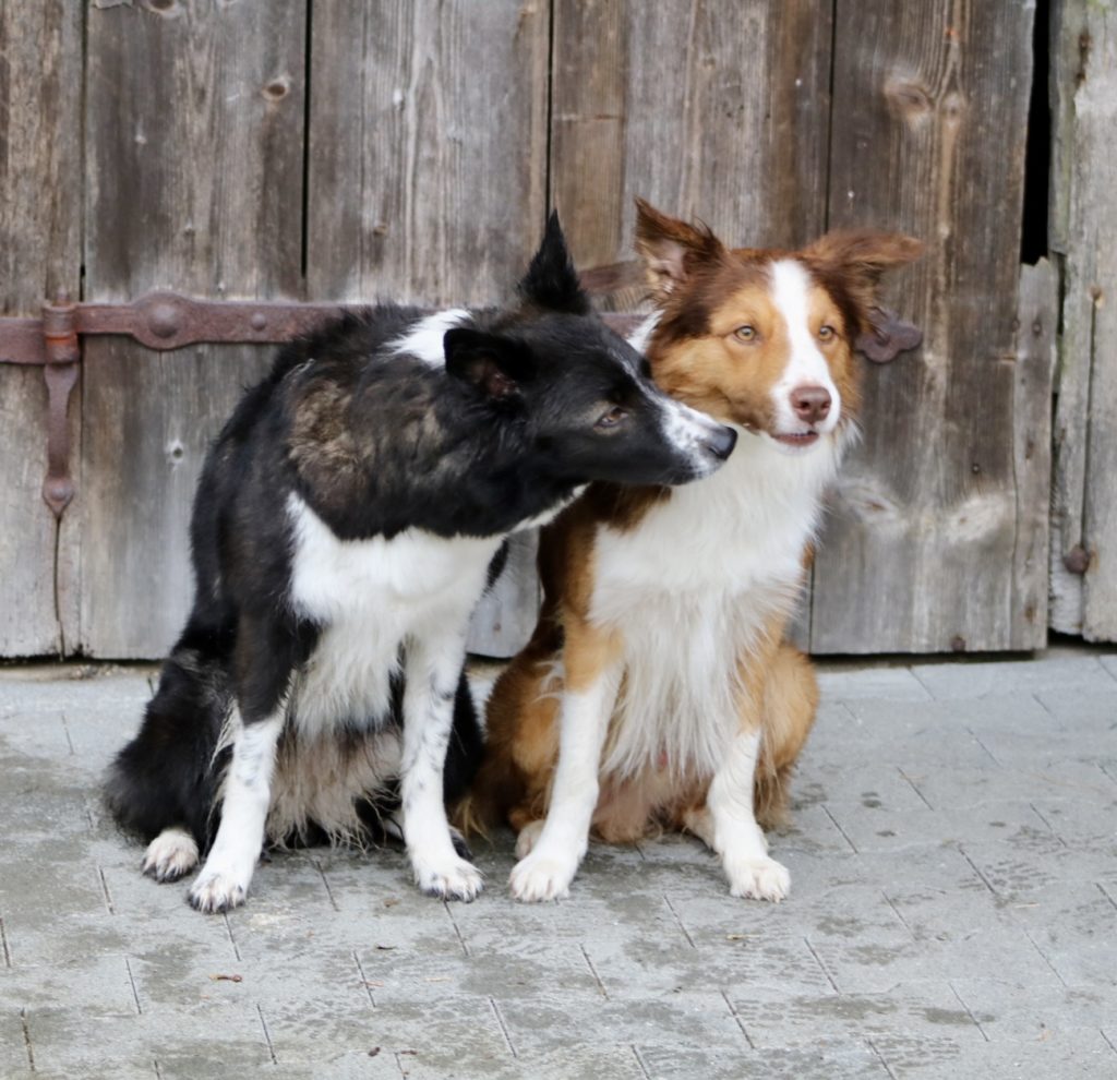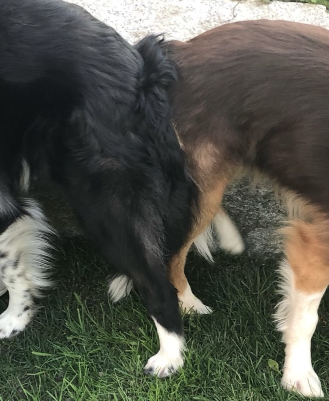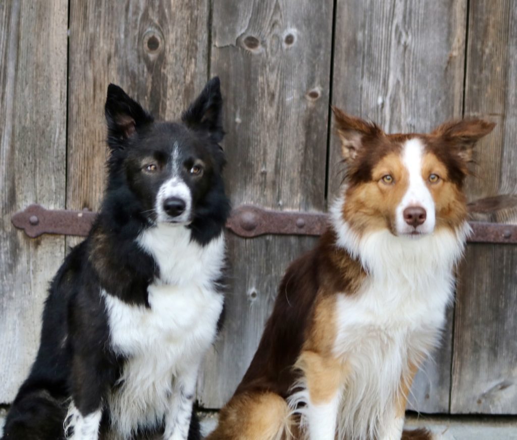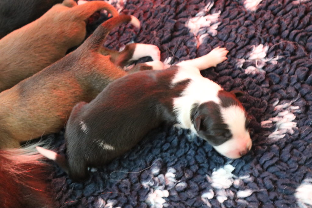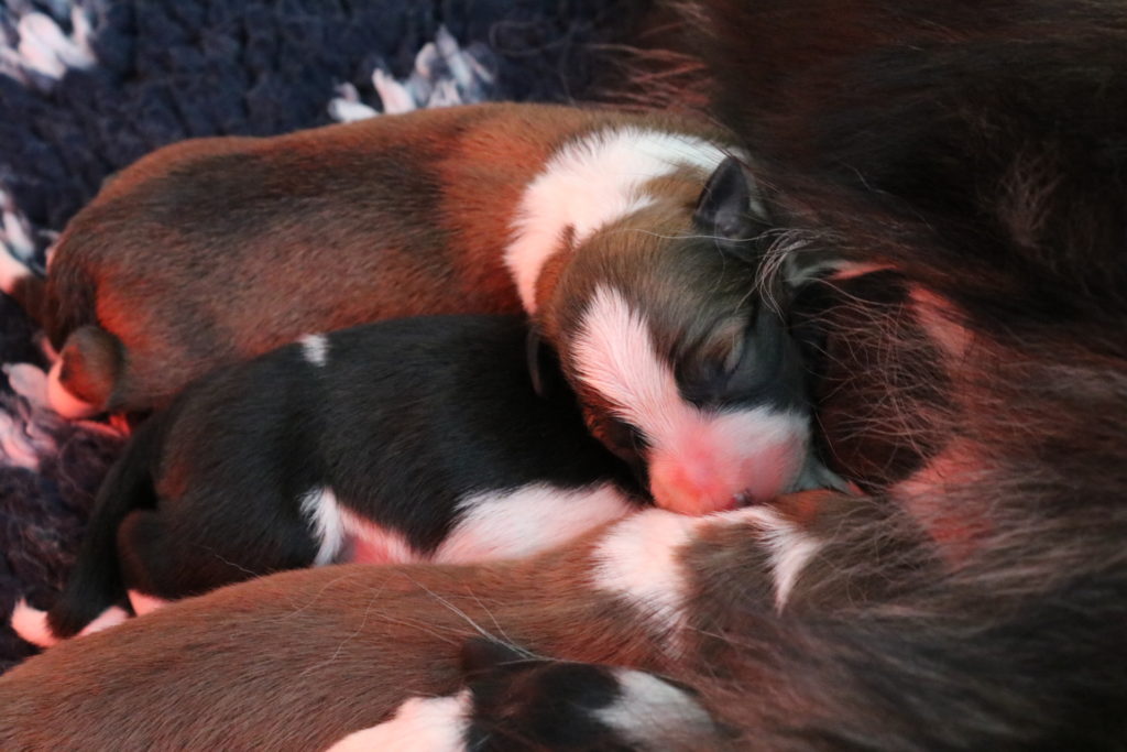 Entre les deux, une femelle noire et blanche, un mâle noir et blanc, et un mâle sable ont complété la fratrie.