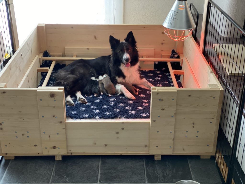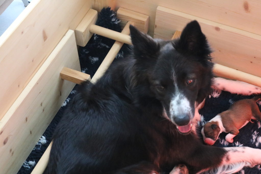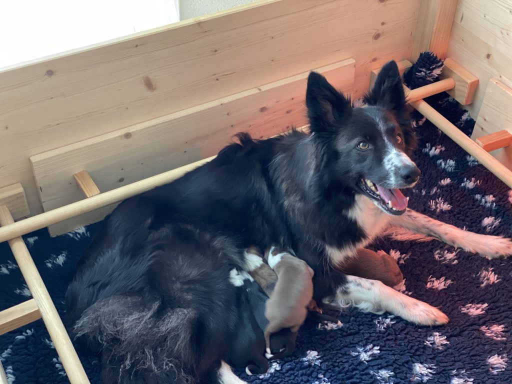 C’est après une nuit très agitée que le premier chiot est né le 9 juin 2025 à 10 h 02. Un mâle de 389 grammes, brun et blanc, à l’image de sa grand-maman Enjy.